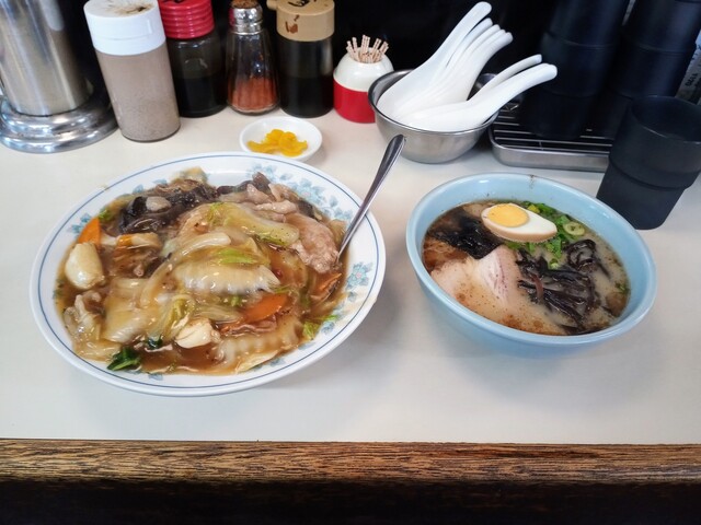 暫くして中華丼と半ラーメンが同時に提供されました。中華丼、なかなかボリュームありそうです。少し醤油が効いたような濃い目の色です。ラーメンは小ぶりながら煮玉子もチャーシューもしっかり入ってます。