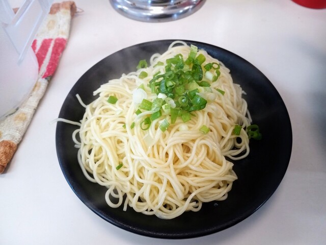 尋ねてみたところ、麺増しは出来ず、野菜大盛だけだそうです。替玉は出来るのかもしれません。実際に食べてみると、麺はかなり細め。ラーメンと同じ麺かもしれません。