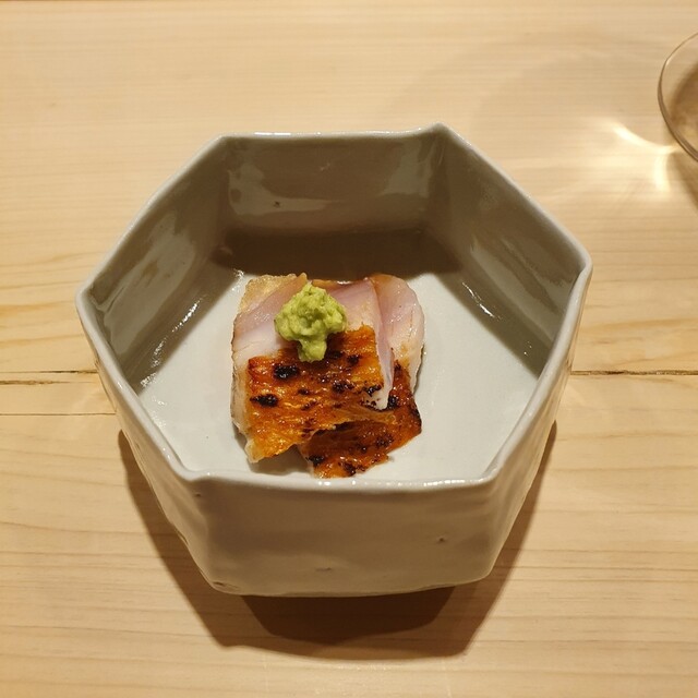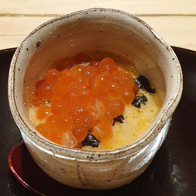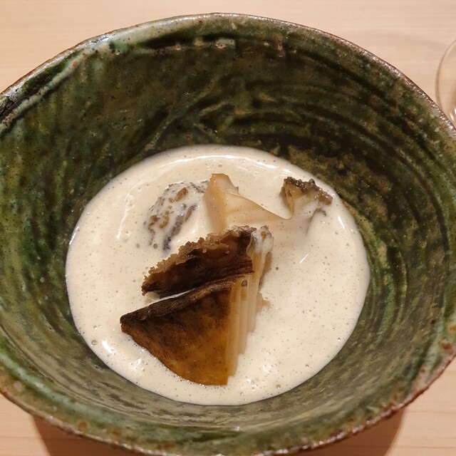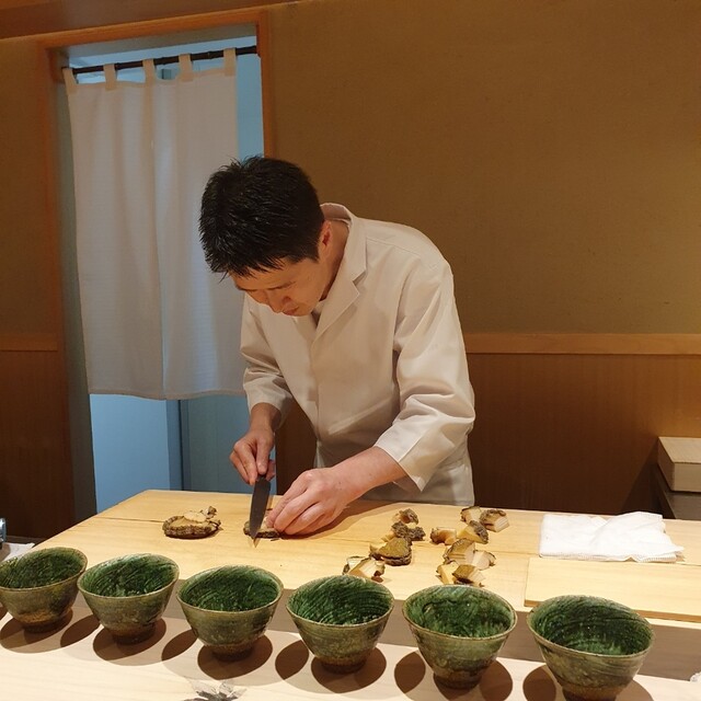 彼のおつまみは、アマダイとマイタケから始まりました。秋のクリアな味わい。続いて、シンプルなキモソースを添えたアワビなど、シンプルで美味しい前菜がいくつかありました。少し珍しい味ですが、非常に興味深い準備です。思いがけない料理がたくさんある楽しい旅だったので、彼の肴料理をひとつひとつ楽しんだと思いました。友達と私は毎回びっくりするのを我慢できませんでした!