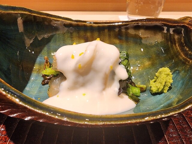 今日は、大将の創造力がぐっと増したように感じました!個性的で美味しい料理がありました。例えば、アスパラガスのしらすときんかんの和え物は、とても美味しい組み合わせでした!ホタルイカは、焼き加減によって自分たちで調理することができました。