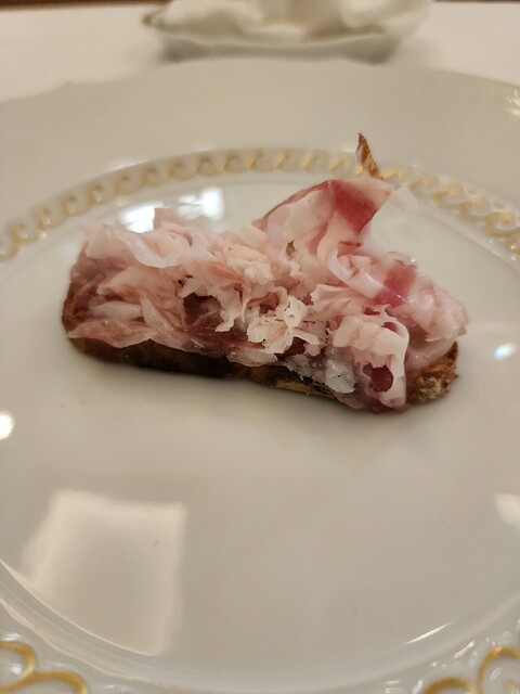 今日は、ワインペアリングが充実したコースメニューを選びました。一人当たりの総額は約85,000円。前半は基本的に普通のコースメニューで、後半は様々なハムの試食があります。