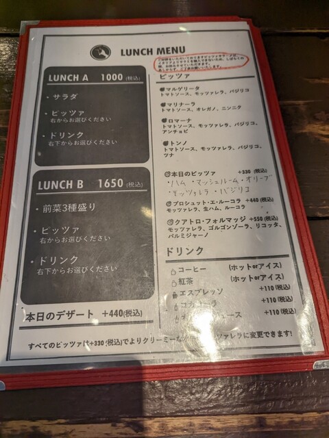 追加料金で、本日のピッツァ(+500円)、プロシュット・エ・ルッコラ(+700円)、クアトロ・フォルマッジ(+600円)も。