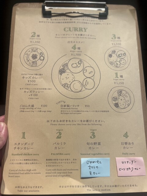 このメニューの中で1.2.4番のカレーを注文したが、どれもが深い味わいで全く水っぽさがなく、それぞれの素材の旨味を凝縮したような最高のカレーでした。