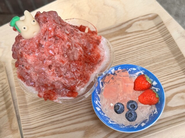 かき氷には、果肉を感じられる濃厚な苺ソースがたっぷりとかかっています。ほのかに酸味のある苺ソースに、やさしい甘さの練乳をかけた王道の組み合わせです。別添の小皿には、苺・ブルーベリー・苺味の寒天が入っています。
