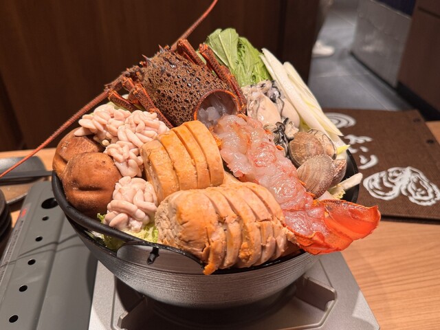 海老・牡蠣・あん肝など豪華食材がたっぷり投入された贅沢鍋。
