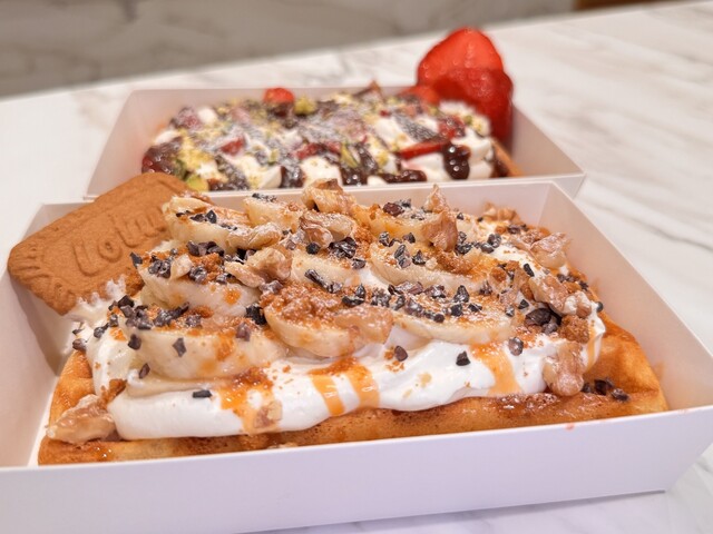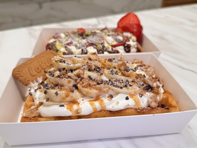 今回は、スタッフさんおすすめの組み合わせである「いちご&ピスタチオ」と、自分でカスタマイズをしたキャラメルバナナのワッフルを注文しました!