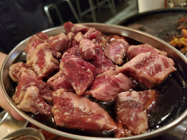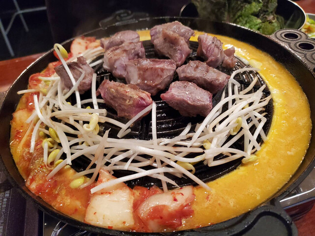 玉子の一品料理、ケランチムは大好きなのですが、その卵液を利用した鍋が韓国にはあるそうで、専用鍋で、その卵液とチーズ、キムチに火を入れた物と豚のハラミ、カルメギサルを合わせたお料理がめちゃくちゃ美味しい
