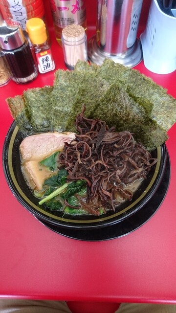 豚骨醤油ラーメン並盛730円、のり100円、きくらげ100円に茎わかめ110円を麺かためで。