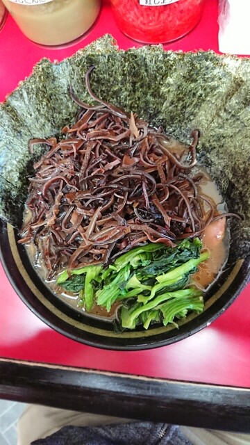 豚骨醤油ラーメン並750円、トッピングはのり100円にキクラゲ100円、そして国産生ほうれん草150円を購入。