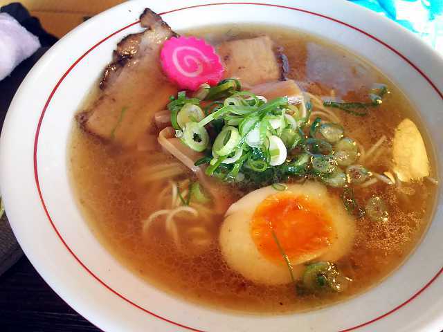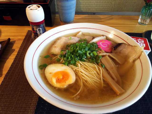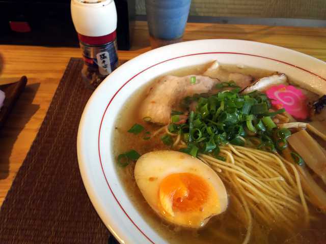 時間が遅くて数量限定の黄金そばや洒落そばは売り切れだった。よってイチオシの看板メニューの塩そばを注文する。あ、ちょっと贅沢して塩チャーシューにした。