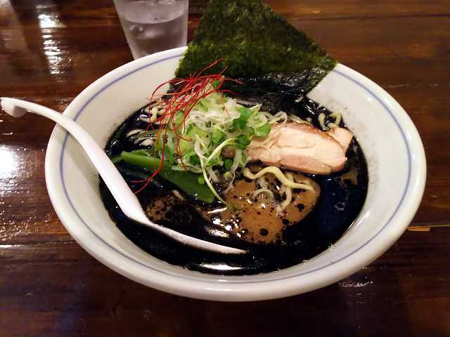 見た目は表面が真っ黒のスープ。こりゃ、濃厚なんだろうなぁ……。と一口スープを飲んでみると、意外や意外。これがスッキリとした味である。薄いとかそういうんではなく、しっかりとした味で飲みやすいスープである。マー油も全然しつこくない。