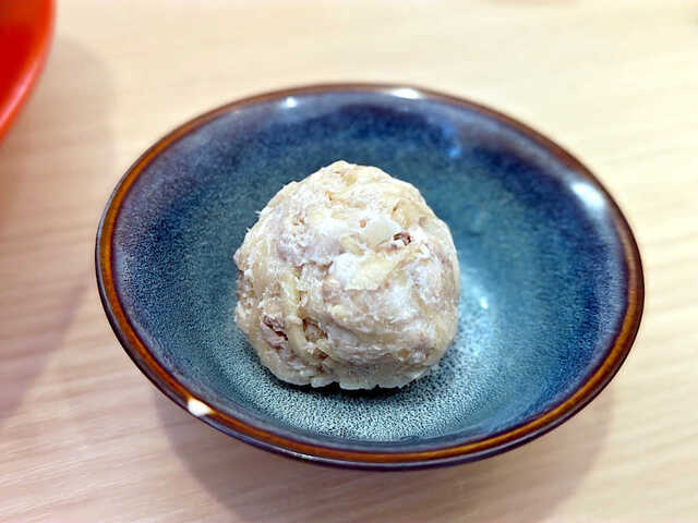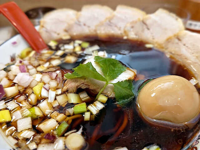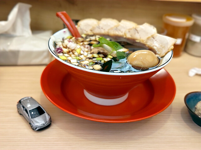 麺が見えないくらいのトッピング。サイコロチャーシュー、刻み赤玉ねぎ、刻みネギ、あげたま、そして、いりこを潰したもんだろうか。そして、中央にはとろろと温泉卵に糸唐辛子。