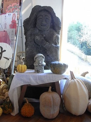 笑顔がキュートなお地蔵様ですね! 普段は外におられるそうですが年末の3日だけ中に入られるとか! 私たちラッキー「田の神さぁ」の前で料理いただきましたぁ~ 店内天井が高くて三方にとられた窓からは四季折々の風景がみれます