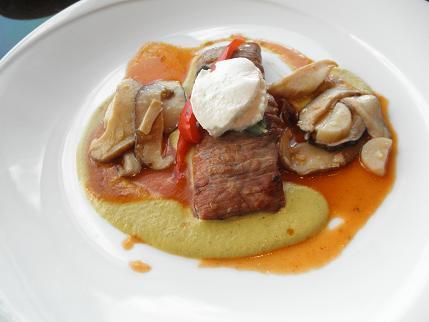 メインは、軽く燻製したカツオのグリエ 完熟トマトソースとガーリックバルサミコ