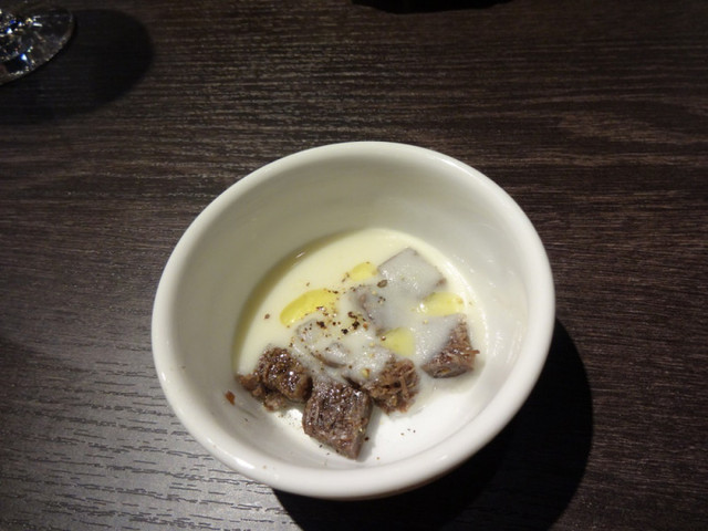 お通しは、馬スジのヴィシソワーズの冷製スープ350円