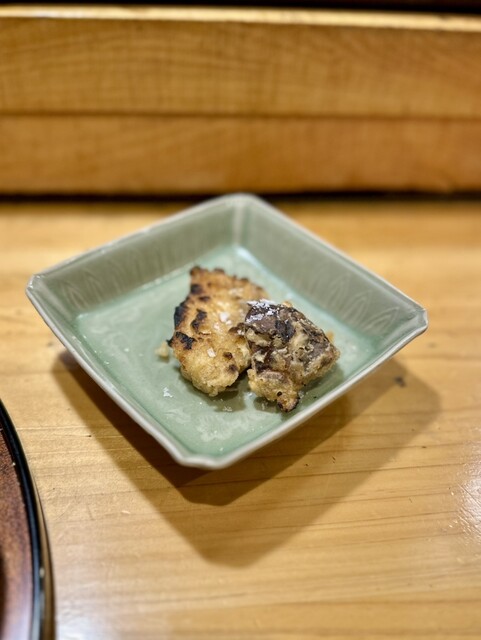 天ぷらは一度揚げてから、炭火で仕上げる。カウンター越しから丁寧に炭と真剣勝負している店主の姿を拝見出来た。炭の香りを纏った鯛と椎茸の天ぷらは、カリッと揚げられており、旨みが詰まった絶品の天ぷら。