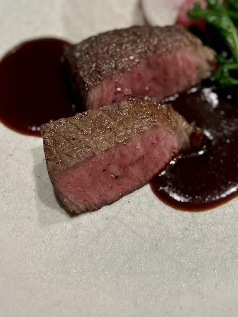 ⑤和牛シンシンのロースト: もも肉の内側の希少部位であるシンシン。表面は心地よく焼かれ、中はレア気味で火入りは最高。思わず頬がゆるむ逸品だった。妻がメインとして頂いた「津軽どりのバロティーヌ 根菜のポトフ」も一言で言うと最高。