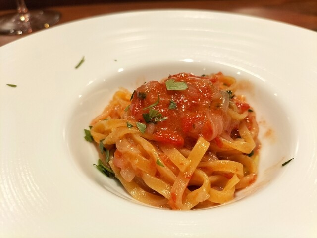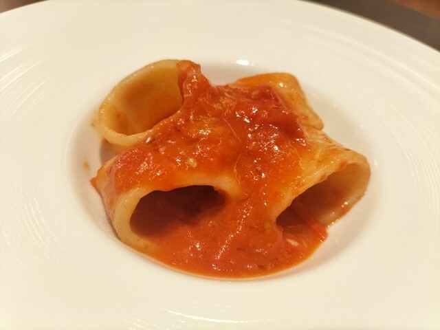 パスタも今までの訪問で食べたことのないものということで、パッケリという丸い輪っか状のパスタをフレッシュトマトのソースで出してくれました。