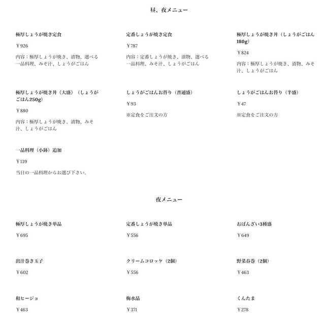 『生姜焼き専門店』という、独自のジャンルに惹かれて奥さんと二人で。食事だけの注文でしたが、なんといっても、お箸でほぐれる、やわらかく煮込まれた豚の生姜焼きは絶品でした!本当にお箸でするっと極厚の豚肉が割れます。 これは新食感!なんと20時間も低温でじっくりと調理されているそうです。 いや、なんだか新しい触感でとっても上品なお味でした。まるで、煮込まれた牛タンのホロホロの柔らかいお高い料理を食べたみたいなのに、リーズナブル。また、新たな普段使いの通えるお店と出会えてよかったです。厨房にはイタリアンで修行されたおねえさんが愛想よく対応してくれました。 ブライニング調理法を採用されているとか…。