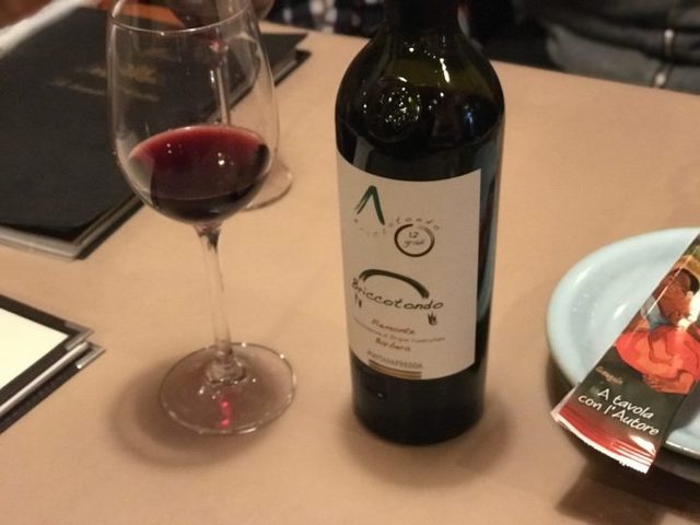 私たちが選んだ1本は赤ワインの500ml「BriccotondoPiemonteBarberaFontanafredda(ブリッコトンドバルベーラピエモンテフォンタナフレッダ)」。バルバレスコほどではありませんが、しっかりとボディがあって、果実味が華やかな1本。お店では2800円でした。