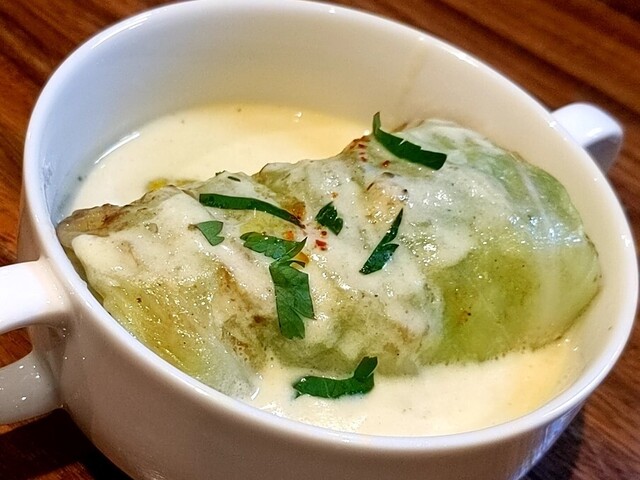ロールキャベツの具に牡蠣を使い、スープも牡蠣出汁という、牡蠣尽くしの珍しい一皿でした。