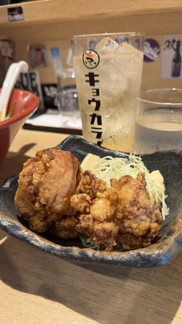 ラーメンだけでなく、「しそぎょうざ」や「九条ねぎぶっかけからあげ」などのサイドメニューも充実。日本酒や焼酎の瓶が並ぶカウンターがふつうのラーメン屋さんとの違いを感じさせます。