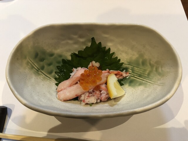 ・小鉢:ズワイガニのイクラ添えで、ズワイガニの身がものすごく柔らかくジューシーで、味付けが控えめかつ旨みが強く、めちゃくちゃ美味しかったです。
