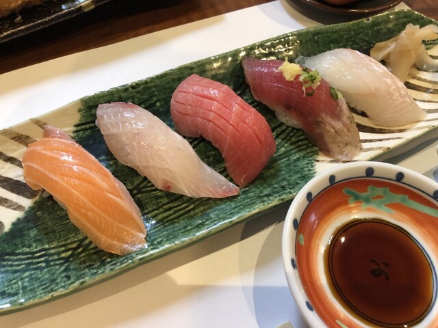潮さいコース(前菜、小鉢、焼魚、エビフライ、茶碗蒸し、にぎり五種盛り、赤だし、漬物、デザート):3740円のにぎり五種盛り