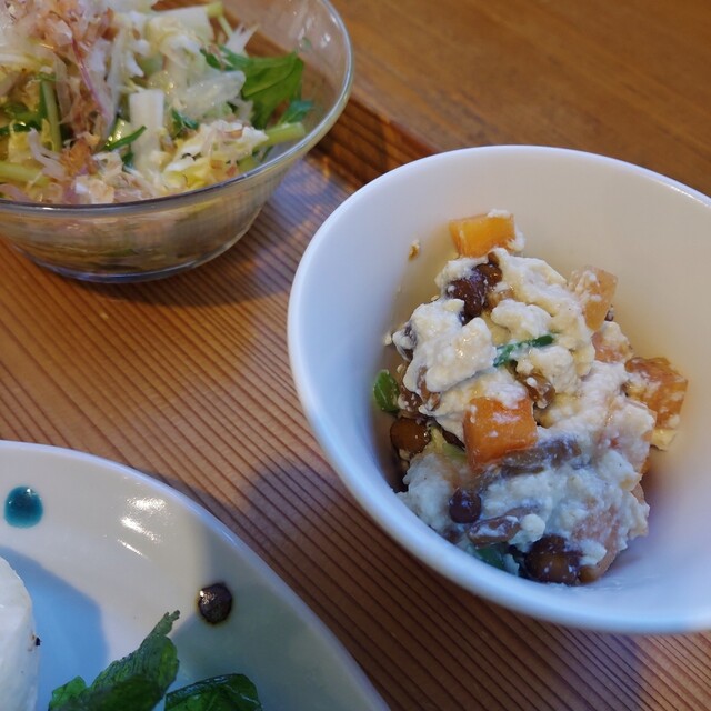 *さつま芋のサラダ、*りんご春菊の白和え、*八朔ゼリーも