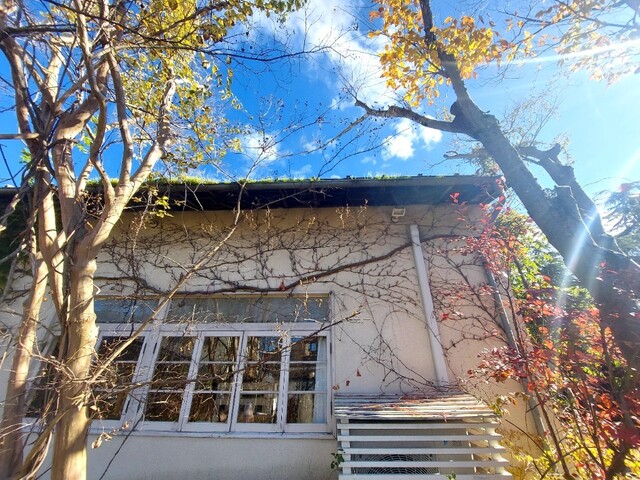 線路の脇、三角の敷地に、建屋が1、2、3、4つ。