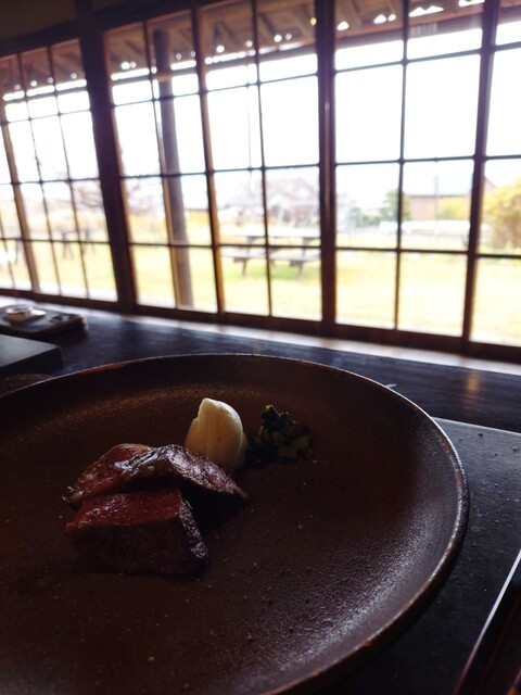 *淡路“くぬぎ座牛”のロースト、カブは小麦の外皮を使ったぬか漬け、葉は浅漬け