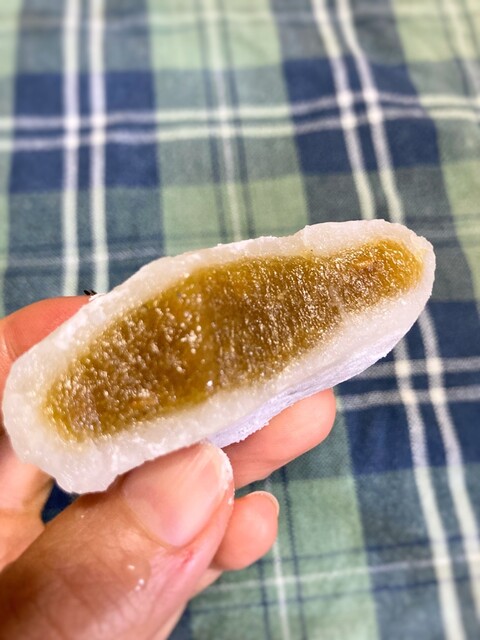 大福の生地自体はもっちりしてて大福というよりはわらび餅感?ゼラチンみたいな食感がつよいお餅に、予想外のちょっと緑味のかかった黄土色の中身。