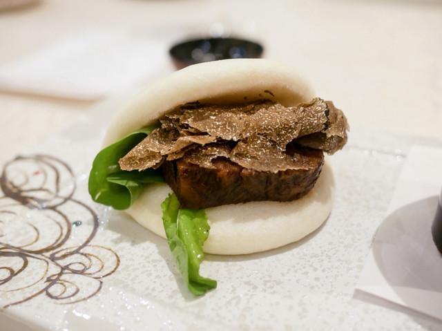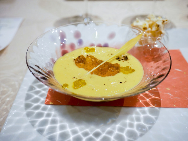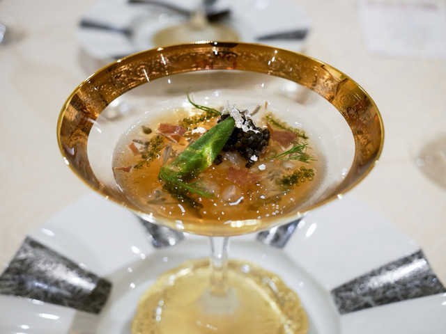 名古屋コーチン、黒豚、黒毛和牛それぞれから「2:4:4」の比率でスープを取って、味付けは塩のみのスープ。具は、宮崎牛のスネ、利休麩、干しナマコ、松露(中国産のトリュフではありません)が使われています。鶏、豚、牛の美味みを”黄金比”で楽しませるスープ。具はあくまで脇役で、それぞれ違った食感で楽しませてくれます。素材感を楽しませる一皿でした。