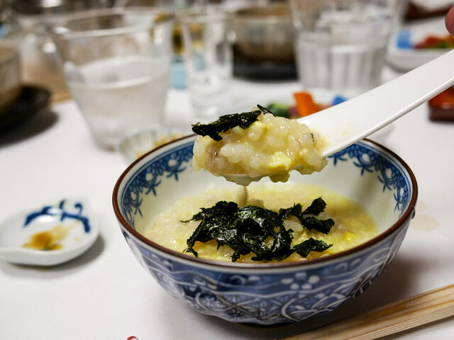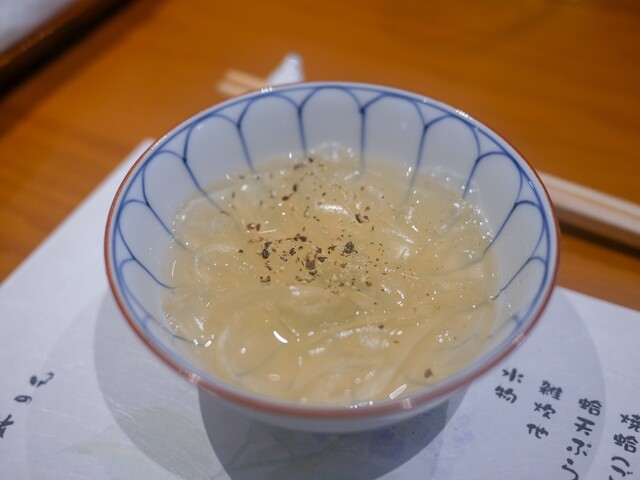 鍋の途中には蛤から出たダシを使って葛切りや野菜が出てきて、最後の残った出汁は〆のそうめんと雑炊でいただきました。