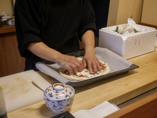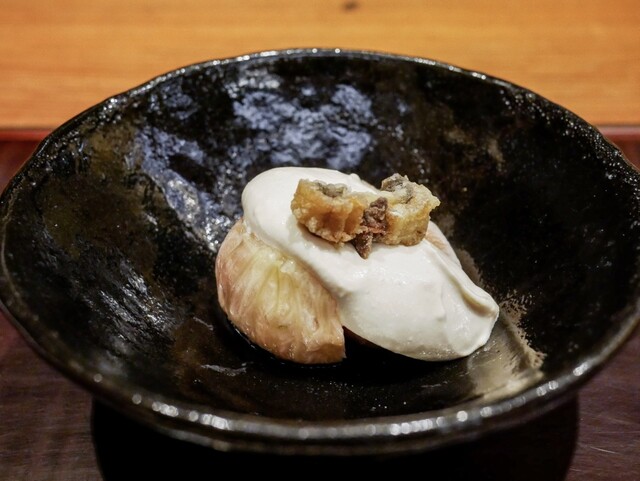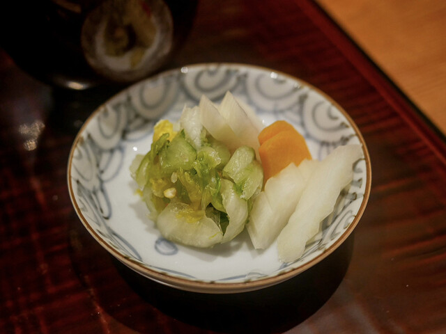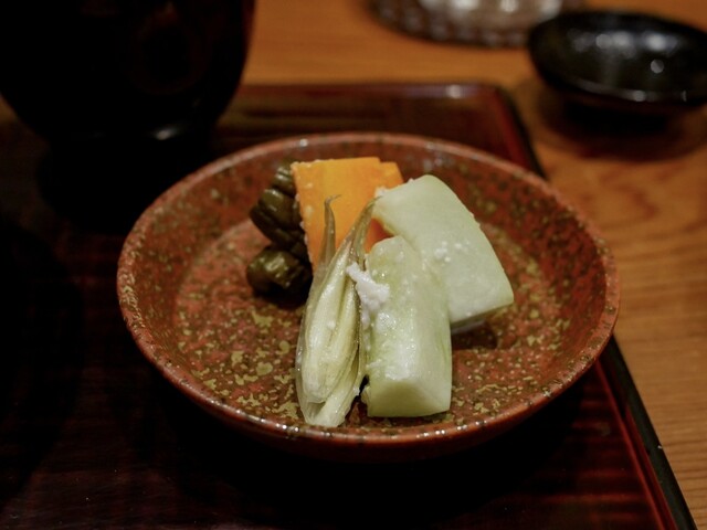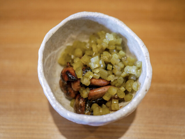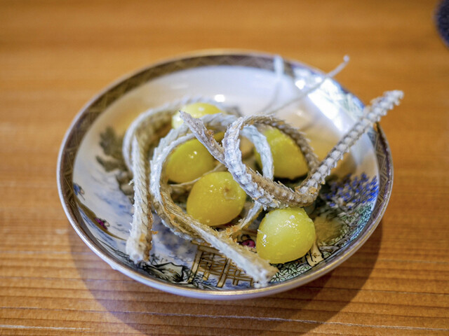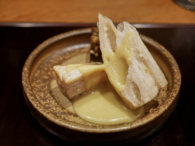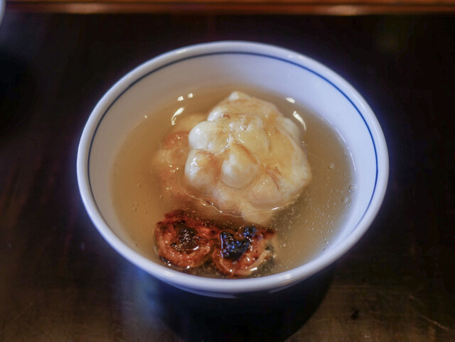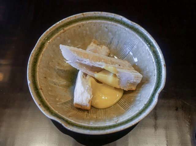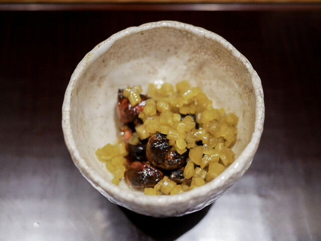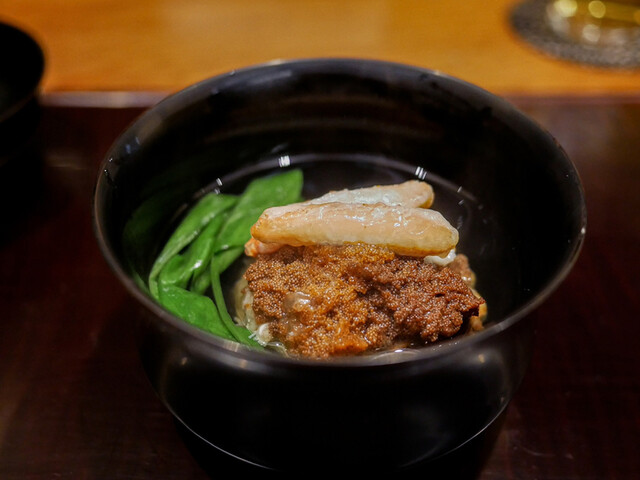 白子の粕汁でお腹を温めた後にカラスミの飯蒸し。カラスミの状態がとてもよく美味。ご飯と合わさったサヤエンドウが食感と香りの良いアクセントに。