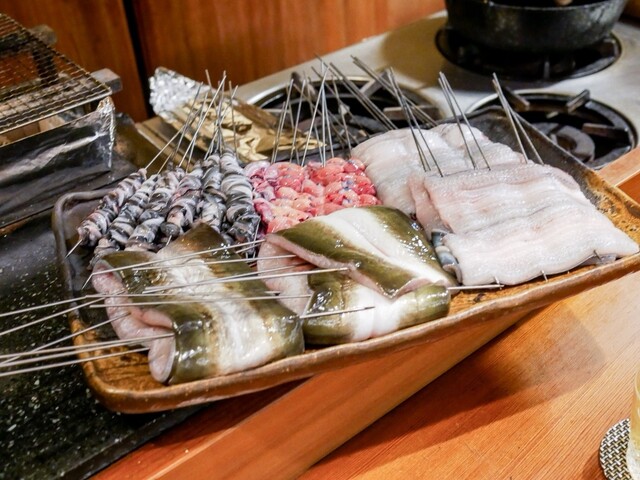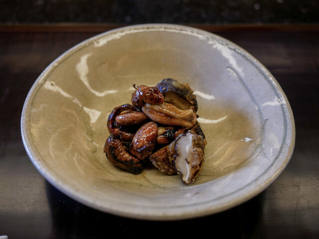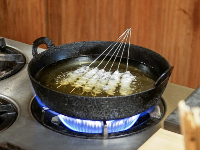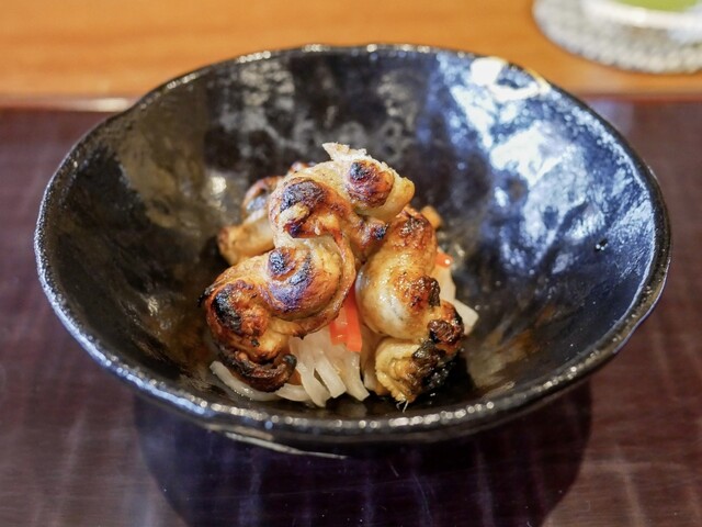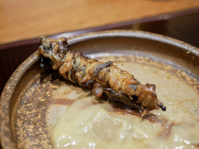その次は肝焼きと地元麻機ごぼうのから揚げ。静岡野菜は本当に良いものが多いです。うなぎのヒレは揚げて甘いタレに漬けて海苔で巻く、瞬さんでは定番のスタイルで。