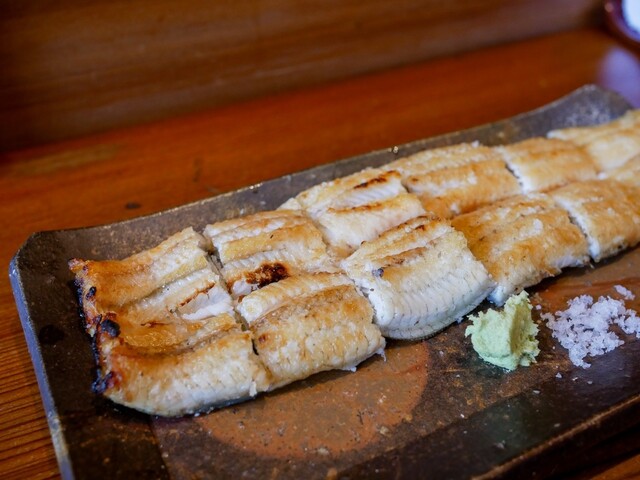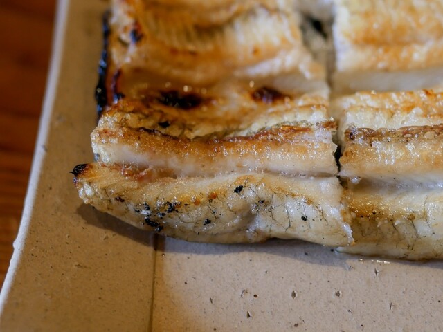 白焼きは3人で2尾。鰻自らの脂で揚げ焼きのように焼き上げた白焼きは適度に脂が落ち、サクサクの食感が大好き。下手な白焼きは身が縮んだように見えるけど、上手に焼いた白焼きは味がふっくら膨らんだように見えます。