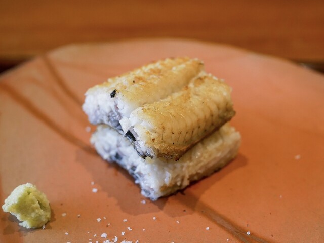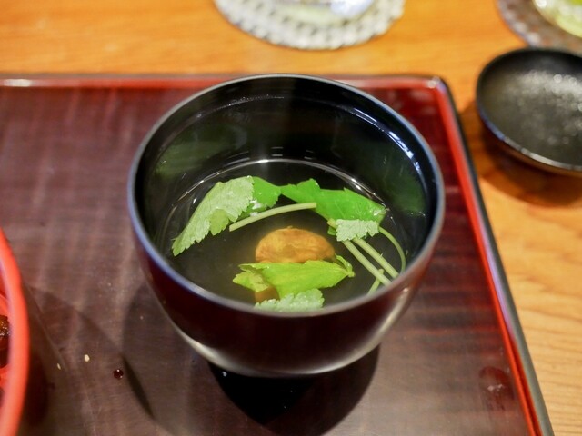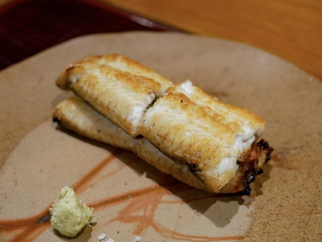 お椀は、この日は百合根饅頭に葛で固めたお出汁をかけたもの。これでもかというほど百合根が使われてて、百合根を全方位で楽しむ一品でした。白焼きは天然で。産地は聞き忘れましたが自分好みの皮が薄く、味のしっかりした個体でした。