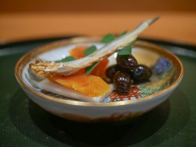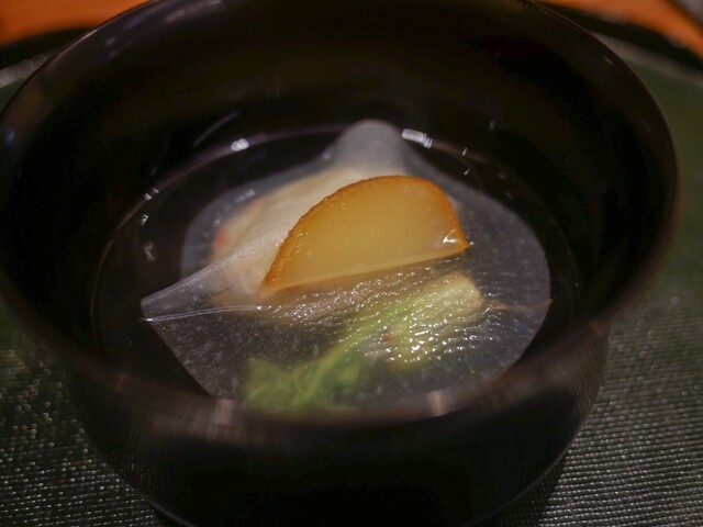 岡田さん自身、京味が大好きでお客さんとして何度も新橋に通って西さんにも可愛がってもらったそうですが、その京味のかつての名物料理を岡田さんなりに再構築したのが「瞬の雲丹茄子」。使う茄子、雲丹、田楽の味つけ、茄子の調理法、香り付けなど京味で食べたものとは良い意味で一線を隔す一皿。かつて京味を愛した1人として妙なノスタルジーに耽ってしまいました。
