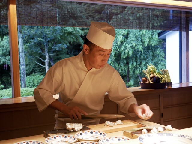 建物の奥が天ぷらカウンターとなっていて、席数は8席となっています。席は先の庭園を向いており、庭園を眺めながら食事を楽しむことになります。今回は新緑を楽しみましたが、秋には紅葉も楽しめるそうなので、今から楽しみでなりません、予約は取れてないですが(笑)
