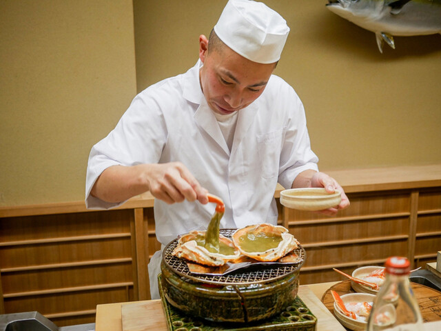 香箱蟹は生きた雌の蟹を客が来てから低温で茹でると言い、内子と外子の半熟感が唯一無二。目の前で捌いて調理してくれる加能蟹も立派なサイズを1人でほぼ半杯という贅沢さ。