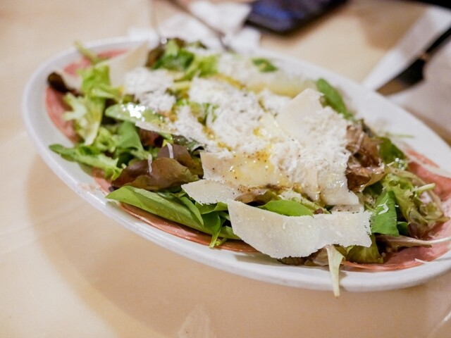 料理はおまかせのみのようです。前半は前菜やサラダをワイン片手につまみつつ、場が温まった後半一気にピッツァを頬張り尽くすのがここでの楽しみ方みたい。