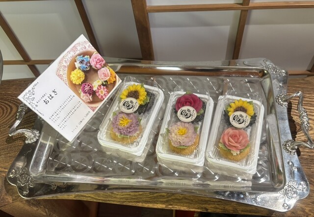 二人ともおはぎと温かい加賀棒茶のセット、私は可憐な花のおはぎ、友人は可愛い青鬼さんを選びました。