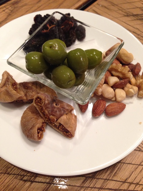 前菜の干しブドウやイチヂク、そしてチーズや生ハムでワインが進む。