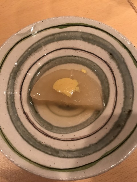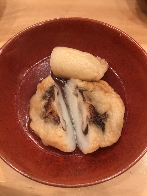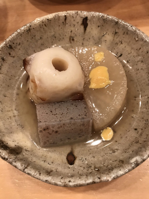 おでん屋だけどお通しに続いてお造り。こちらにもこだわりがあるらしい。大根は別で来て、その後盛り合わせ。上品な程良い味付け。素材の旨みが味わえる。そして〆の豆腐ご飯の優しいこと。