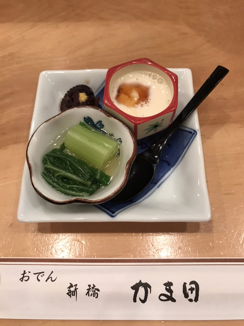 前にテレ東の番組で見て気になっていた新橋のおでん屋、かま田。友人が予約を取ってくれてようやく来訪が叶った。予約は3500円のコース。