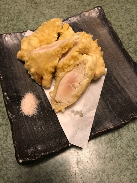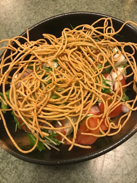 まずは揚げ蕎麦サラダ、とり天、お造り3種。サラダに乗ってる揚げた蕎麦が美味しい。とり天も大分で食べたものを思い出す美味しさ。