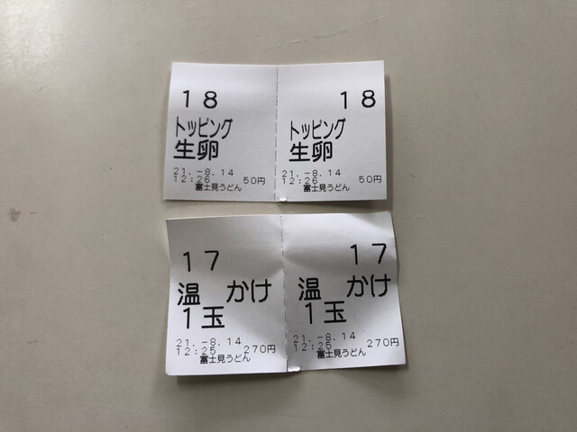生卵が大盛(0.5玉)の食券 2021/08/14 かけうどん 1.5玉 270円+50円 いか下足 120円