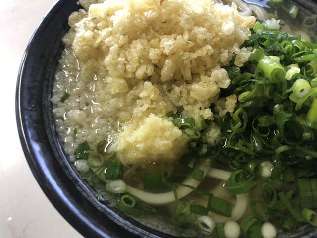 自分で出汁を注ぎ、ネギ、生姜、天かすを盛る。
