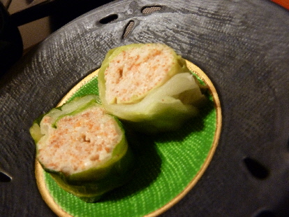 まずは 先付 こっぺと蕎麦の実。春キャベツ包みから。